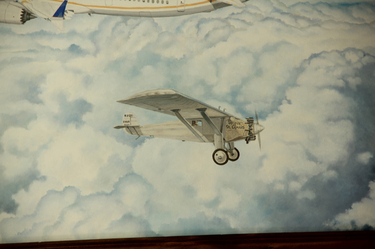 Oil painting celebrating the approaching 100 year anniversary of Charles Lindbergh’s historic solo flight from New York to Paris in 1927 on the ‘Spirit of St. Louis.