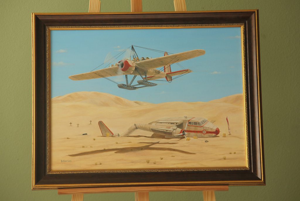 Oil painting based on the classic 1965 film, ‘Flight of the Phoenix’, starring (5 Oscar Winners) James Stewart, Richard Attenborough, Hardy Kruger, Peter Finch, Ernest Borgnine, and George Kennedy.